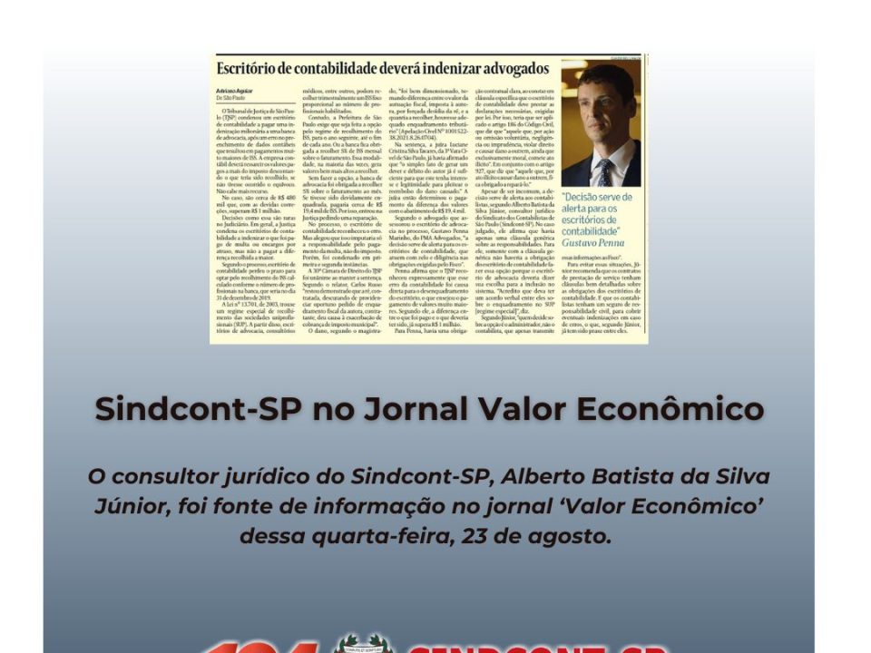 O consultor jurídico do Sindicato dos Contabilistas de São Paulo – Sindcont-SP, Alberto Batista da Silva Júnior, foi fonte de informação no jornal ‘Valor Econômico’ dessa […]