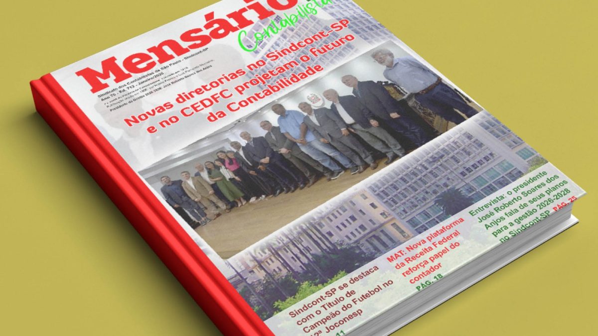 6 de janeiro de 2026A primeira Revista Mensário do Contabilista de 2026 já está no ar. Leia no editorial e em uma entrevista exclusiva com no novo presidente do Sindicato dos Contabilistas de São Paulo-Sindcont-SP, José Roberto Soares dos Anjos, o que ele diz sobre suas metas de projetos para a nova Diretoria que se inicia em Janeiro de 2026 e vai até dezembro de 2028. “Sabemos que a Contabilidade vive um dos períodos mais desafiadores de sua trajetória, pressionada por transformações tecnológicas, reformas estruturais, novas exigências regulatórias e um ambiente econômico cada vez mais complexo, e é justamente neste cenário que iniciaremos a nossa gestão, com força e motivação para enfrentar esses desafios”, prometeu o presidente.